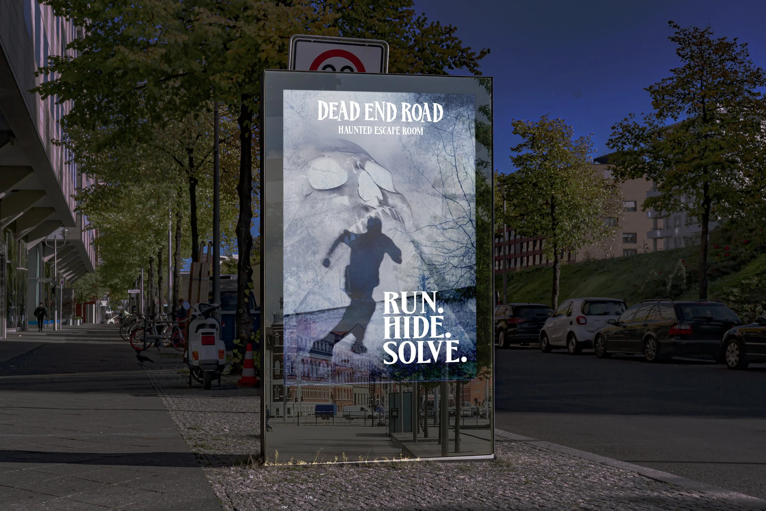 Dead End Road is a haunted escape room experience set in a sleepy, forgotten town at the end of an eerie dirt road. Inspired by the supernatural and the occult, the brand identity uses a moody blue color palette to create a chilling yet intriguing atmosphere. The concept is designed to attract adventurous Denver locals seeking immersive thrills and mysterious experiences. Through atmospheric visuals, eerie typography, and haunting storytelling, Dead End Road positions itself as a destination where curiosity leads visitors down a path they may not escape.